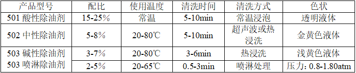 2、除油劑系列產品(共有三種型號:501、502、503)。